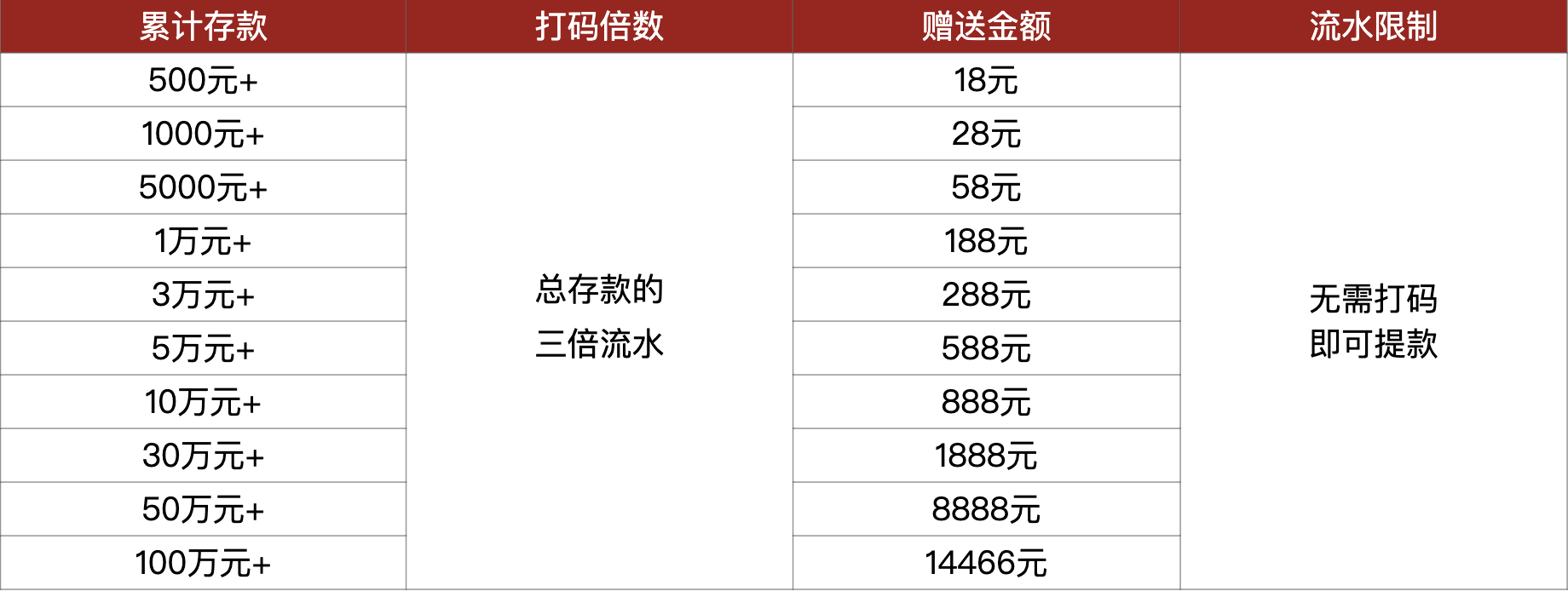 例: 当天累计总存款10000元,次日即可一键领取188元彩金,无需流水即可提款!